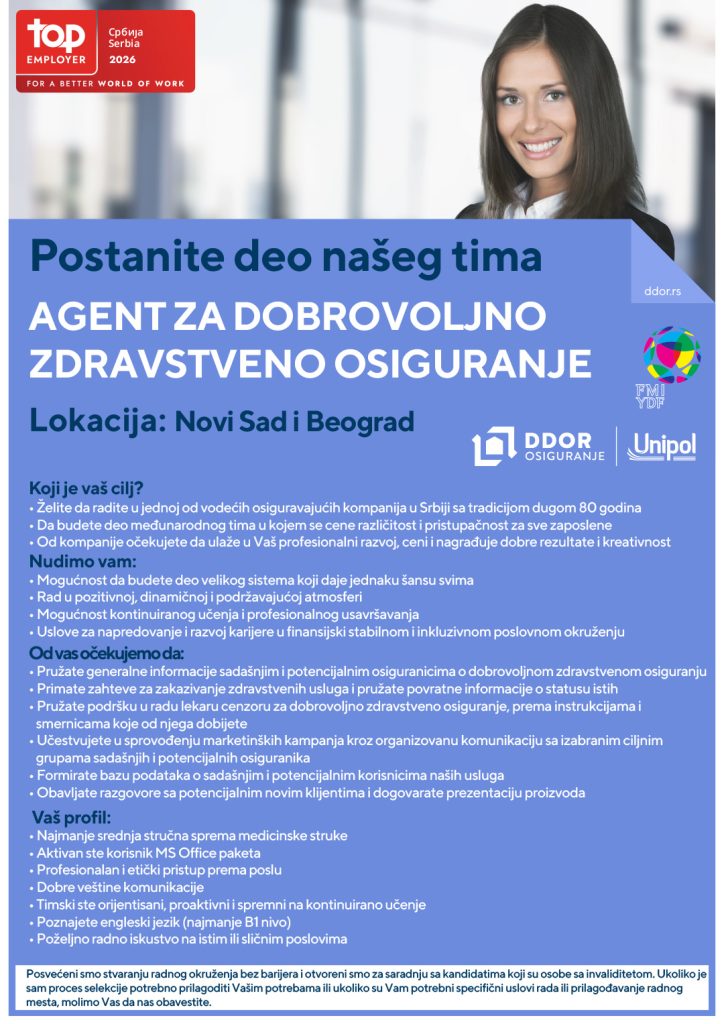 Tražimo osobu za poziciju: Agent za dobrovoljno zdravstveno osiguranje