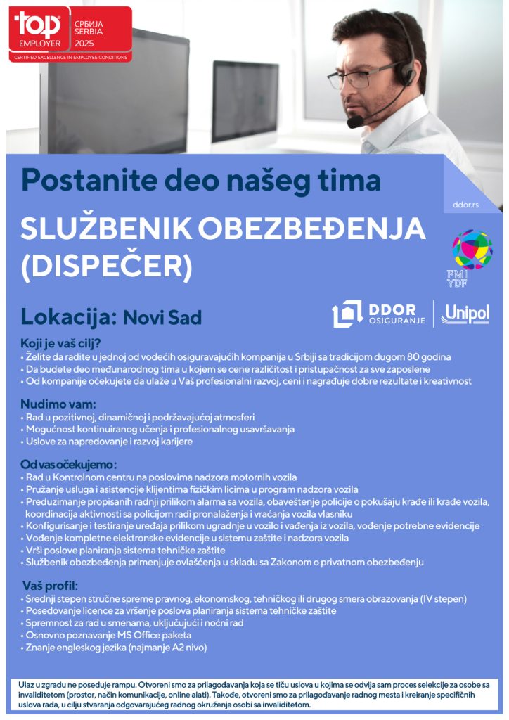 Tražimo osobu za poziciju: Službenik obezbeđenja (dispečer) u Novom Sadu